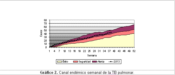 La tabla 2 y Gráfico 2 revelan la presencia de epidemia por tuberculosis pulmonar en las primeras siete semanas, mientras que en el resto de las semanas analizadas se mantuvo en alerta.
