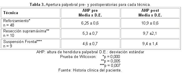 Con respecto al tratamiento quirúrgico de la afección, se practicó reforzamiento de la aponeurosis a 48 pacientes; se registró una altura de la hendidura palpebral media de 6,25 ± 0,6 cm antes de la cirugía y un promedio de 10,9 ± 0,6 cm con posterioridad a ella. Se realizó resección supramáxima de la aponeurosis en 10 pacientes, los que registraron una altura de hendidura palpebral preoperatoria media de 5,3 ± 0,7 cm y una altura de la hendidura palpebral media de 9,7 ± 2,1cm al mes de operados. Se le practicó suspensión frontal a 9 pacientes, con una altura de la hendidura palpebral media preoperatoria de 4,6 ± 0,7 cm y una media de 9,4 ± 1,4 cm al mes de operados. En las tres técnicas empleadas, fue significativamente mayor el valor medio de la hendidura palpebral después de la intervención quirúrgica (Tabla 3).