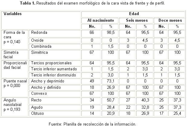 En el examen morfológico facial de frente y de perfil se pudo constatar que la forma redonda predominó al nacimiento, con una frecuencia del 98,5 % y descendió al 95,5 % a los seis meses, para mantenerse igual a los 12 meses, sin significación de cambio (p = 0,140). En el 100 % de los niños de la muestra, la cara se presentó simétrica; esta característica se mantuvo en los tres momentos del estudio, mientras que la proporcionalidad se observó en el 95,5 % de los casos en estos mismos tiempos. Así se expone en la tabla 1, en la que también se constata que el puente nasal, que al nacimiento era ancho y deprimido en el 73,1 % de la muestra, evolucionó hacia el tipo ancho y definido a los seis meses en el 100 % de los niños, evolución que resultó ser muy significativa (p = 0,000). El perfil se mantuvo convexo en todas las mediciones en el 100 % de la muestra.