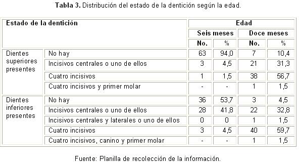 El estado de la dentición de los niños de la muestra a los seis y doce meses de edad se expone en la tabla 3. A los seis meses, habían brotado los inferiores en el 41,8 %; en el 4,5 % estaban presentes los incisivos centrales superiores o uno de ellos, mientras que solamente en el 1,5 % de los lactantes habían brotado los cuatro incisivos superiores, y en el 4,5 % los cuatro incisivos inferiores. En el 94,0 % de los examinados, no había brotado ningún diente superior, ni en el 53,7 % diente inferior alguno. A los doce meses, se evidenció un gran progreso en el brote dentario. En el maxilar, el 56,7 % de los niños contaban con sus cuatro incisivos; el 31,3 % presentaban incisivos centrales o alguno de ellos, en el 10,4 % aún no había dientes y en un 1,5 % estaba presente un diente posterior. En la mandíbula se observó un mayor avance, pues el 59,7 % contaba con sus cuatro incisivos, el 32,8 % con los centrales o alguno de ellos, solo un 4,5 % no presentaba dientes inferiores, en un 1,5 % se evidenció la presencia del canino y de un molar temporal, además de los incisivos.