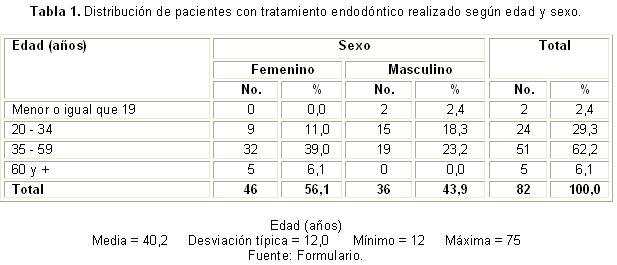 En la tabla 1 se refleja el mayor número de personas que requerían el tratamiento endodóntico, incluidas en el grupo de 35-59 años: el 62,2 % de la muestra. Se encontró un predominio del sexo femenino, que se corresponde con el 56,1 % del total de pacientes estudiados.
