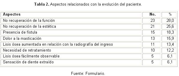 Para constatar la evolución, se estimaron variables como: persistencia del proceso periapical, presencia de signos y síntomas postratamiento, recuperación de la estética, recuperación de la función y evolución favorable o desfavorable.