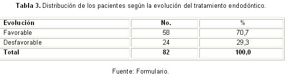 En la tabla 3 se muestra la distribución de los pacientes según la evolución del tratamiento endodóntico: el 70,7 % mostró una evolución favorable de acuerdo con las categorías establecidas, y en el 29,3 % de los pacientes la evolución de la terapia fue desfavorable.