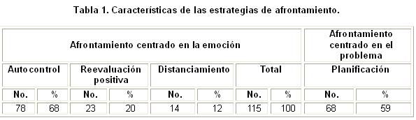 Al evaluarse las estrategias de afrontamiento ante las situaciones estresantes que les afectan (Tabla 1), se constató que predominó el estilo de afrontamiento centrado en la emoción, y dentro de este, la estrategia de autocontrol. Lo anterior es expresión de la propia evaluación de daño predominante, dada la perdurabilidad del agente estresante, en este caso, la enfermedad.