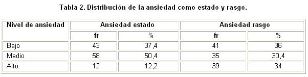 En la tabla 2 se muestran los niveles de ansiedad como estado y rasgo; de manera general, se aprecian niveles de ansiedad medios, tanto en uno como en el otro.