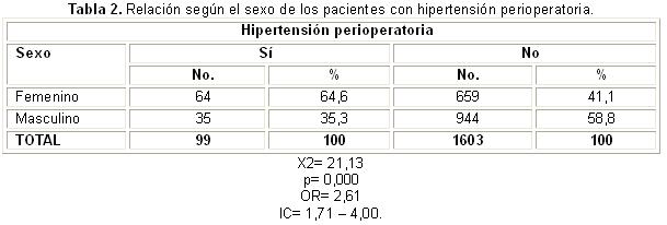 La relación de la hipertensión arterial perioperatoria con el sexo biológico de los pacientes estudiados (tabla 2) mostró que de los 99 que presentaron esos episodios, el 64,6 % pertenecían al sexo femenino, por lo que existió una relación altamente significativa entre ambas variables (p = 0,000). En la determinación de la RPC, se encontró que las pacientes presentaron una probabilidad de padecer de hipertensión arterial perioperatoria 2,6 veces más que los hombres (IC = 1,71 - 4,00).