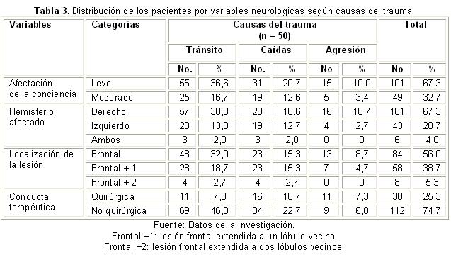 Las pruebas de independencia aplicadas no demostraron asociación entre las variables neurológicas y las causas del trauma: afectación de la conciencia: X² =1,254 p = 0,534; hemisferio afectado: X² = 5,344 p = 0,254; localización de la lesión: X² =4,204 p = 0,379, excepto para la conducta terapéutica: X² = 16,155 p = 0,0003, resultado este último que alerta sobre la importancia de la causa del trauma en la toma de decisiones terapéuticas.