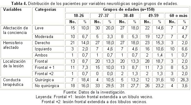 En la tabla 4 se observa que los pacientes que presentaron afectación leve de la conciencia fueron más frecuentes en el grupo de 27 a 37 años (20,0 %); mientras que la afectación moderada predominó en el grupo de 49 a 59 años (12,7 %). Las lesiones del hemisferio derecho se observaron más en los grupos de 27-37(18,0 %), seguido del grupo de 49-59 años (15,3 %); mientras que las lesiones del hemisferio izquierdo prevalecieron en el grupo de 49-59 (10,6 %), seguido del grupo de más de 60 años (6,6 %). Las lesiones localizadas únicamente en el lóbulo frontal fueron predominantes en el grupo de 49-59 años (18,7 %); asimismo, en este grupo de edad fue más frecuente la conducta quirúrgica (31,6 %).