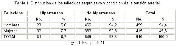 La tabla 1 muestra una mayor mortalidad masculina en la población general, y una mayor mortalidad femenina entre los hipertensos. El 7,7 % de las mujeres fallecidas eran hipertensas, mientras que solo el 5,8 % de los hombres presentaban esta enfermedad.