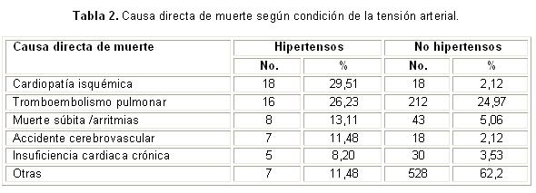 La causa directa de muerte en los fallecidos con HTA fue de origen cardiovascular en más del 88 % de los casos, lo que contrasta con el hecho de que solo el 37,8 % de los no hipertensos tuvieron una causa de muerte de este origen; las principales causas fueron la cardiopatía isquémica y los accidentes cerebrovasculares /ACV), por ese orden; ello puede deberse a la reconocida importancia de la HTA como factor de riesgo cardiovascular, sobre todo en la aceleración de la arteriosclerosis, pero también hay un claro incremento en la prevalencia según aumenta la edad, de forma tan evidente, que en los menores de 60 años es de 200 por 100 000 habitantes y, por encima de esa edad, es superior a los 500 por 100 000 habitantes.4