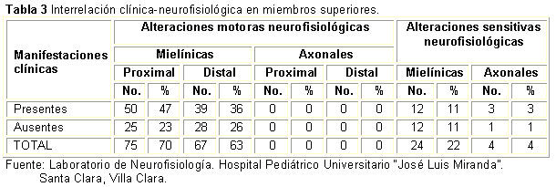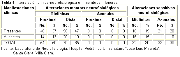 En las tabla 3 y tabla 4 se muestra la relación entre las manifestaciones clínicas y los hallazgos neurofisiológicos; en las alteraciones axonales solo tomamos las que eran realmente patológicas, lo que nos ofrece un criterio de mayor seguridad. Es importante señalar que 8,4 % de los pacientes presentaban manifestaciones clínicas, pero los estudios neurofisiológicos fueron negativos, mientras encontramos un mayor por ciento con estudios neurofisiológicos alterados, tanto en sus componentes mielínicos como axonales sin manifestaciones clínicas, y en su inmensa mayoría con estudios plenamente patológicos. Sin embargo, el mayor porcentaje correspondió a los que presentaban alterados tanto los estudios clínicos como los neurofisiológicos. Se debe destacar, en la lesión sensitiva. la presencia de parestesias, dolor y reflejos alterados; en la motora, la combinación de dolor, pérdida de fuerza y reflejos alterados.