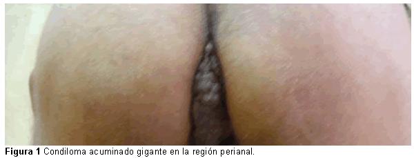 De sexo femenino, raza negra, 53 años de edad, con antecedentes de trastornos dispépticos. En esta ocasión acude a consulta de Coloproctología, pues refiere que desde hace aproximadamente 20 años presenta pequeñas verrugas localizadas en la región perianal, las cuales han aumentado de tamaño durante los últimos seis meses, y se acompañan de prurito y secreciones que manchan su ropa interior. En el momento de la consulta tiene dolor a este nivel y sangramiento al defecar. Al examen físico se observan lesiones exofíticas y verrugosas que se encuentran en el ano y región perianal (Figura 1); las mismas se extienden aproximadamente de 5 a 6 cm de las márgenes del ano. Se diagnostica condiloma acuminado gigante y se decide tratamiento quirúrgico, mediante el cual se realizó resección amplia de las lesiones.