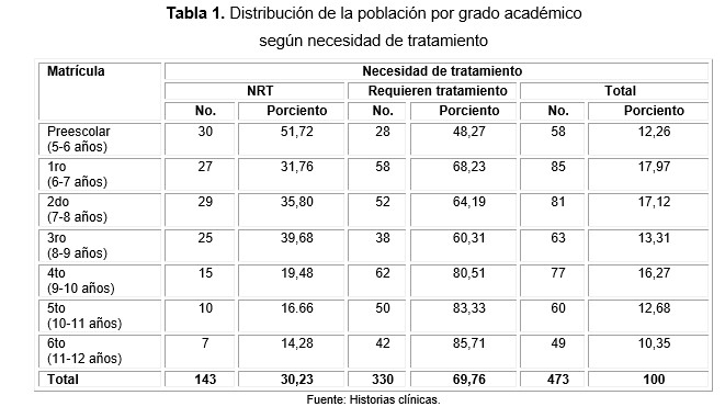 En la Tabla 1 se evidencia una disminución en el número de estudiantes que no requieren tratamiento (NRT) a medida que avanza la edad y el grado escolar; se destacó preescolar con más de la mitad de los niños sanos (51,72 %). En cuanto al porciento general al aplicar la fórmula se obtuvo un 30,23 %.
