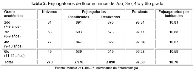 En la Tabla 2 se pueden observar los enjuagatorios de flúor realizados en los pacientes de este grupo de grados, de un total de 2 970 y 11 enjuagatorios que se deben realizar por estudiante en el período analizado (deben aplicarse 2 mensuales y 1 en diciembre por las vacaciones), se realizaron 2 890 (97,30 %) y 10,70 por estudiante.