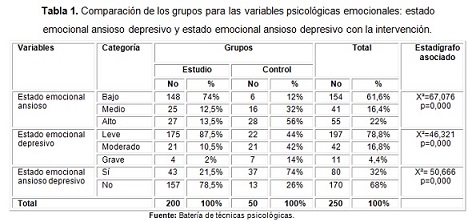 La Tabla 1 refleja el comportamiento de los grupos para las variables psicológicas emocionales: estado emocional ansioso, depresivo y estado emocional ansioso depresivo posterior a la intervención.