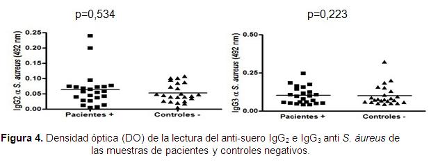No hubo significación en cuanto al valor de la DO determinada al analizar los anti-sueros IgG2 e IgG3 anti S. áureus, en ninguno de los grupos estudiados. (Figura 4)