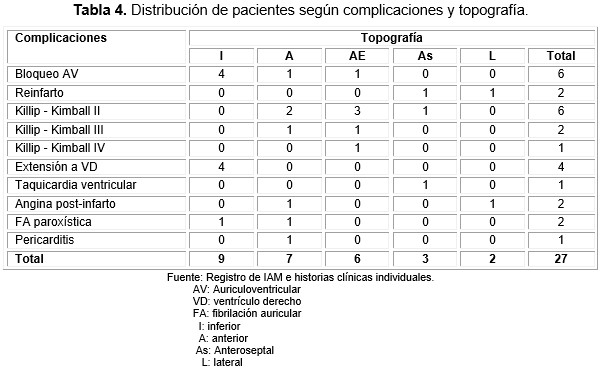La presencia de complicaciones en pacientes, según la topografía definida por electrocardiograma, se representa en la Tabla 4 (solo 27 pacientes sufrieron complicaciones).