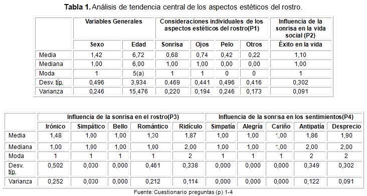 Mediante los resultados se conocen las consideraciones individuales de los aspectos estéticos del rostro, las de la influencia de la sonrisa en la vida social, en el rostro y en los sentimientos, por lo que se pudo establecer la percepción estética en la población objeto de estudio. Las medidas de tendencia central permitieron emitir criterios sobre el comportamiento de los datos. En la medida que la media, la moda y la mediana sean más coincidentes se puede asumir el comportamiento predominante en correspondencia con la tipología del dato. La Tabla 1 muestra que los pacientes cuando miran el rostro de una persona se fijan fundamentalmente en la sonrisa y en los ojos para emitir juicio de valor sobre la belleza. Poseer una sonrisa agradable ayuda a tener éxito en la vida social. La sonrisa puede influir en que el rostro se considere irónico, simpático, bello o romántico; sin embargo, creen que no influye en que el rostro se vea ridículo. Cuando alguien le sonríe sienten fundamentalmente simpatía, alegría o cariño; sin embargo, no sienten antipatía o desprecio.