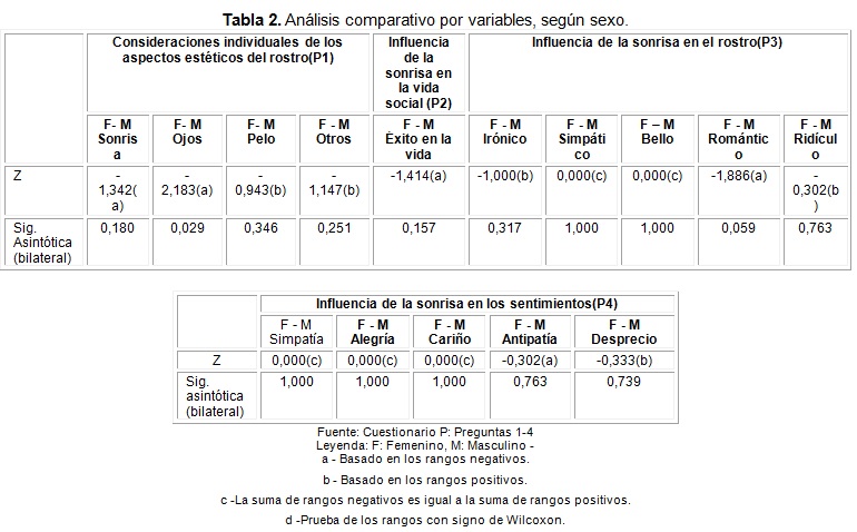 Se compararon los resultados entre los encuestados del sexo femenino con los del masculino para determinar si hay diferencias significativas entre las respuestas por sexo. Se declararon diferencias significativas para la variable consideraciones individuales de los aspectos estéticos del rostro (sonrisa, ojos, pelo, y otros aspectos) (Tabla 2).