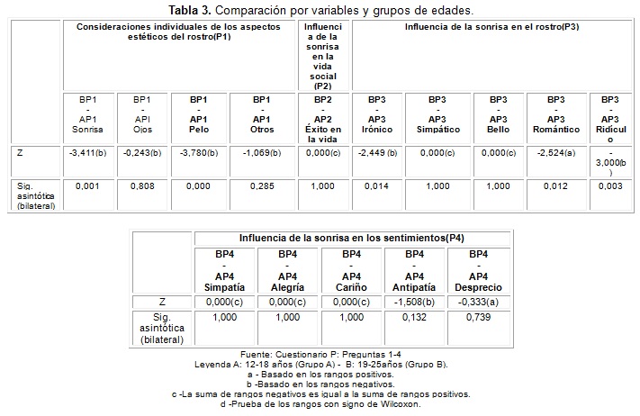 Dada la relación de la variable edad con las restantes variables, se realiza un análisis del comportamiento de los datos aportados, como respuestas por rango de edad. Se manifiestan diferencias significativas para las variables: Consideraciones individuales de los aspectos estéticos del rostro e influencia de la sonrisa en el rostro (Tabla 3). Para estas variables, en correspondencia con los resultados de los análisis de tendencia central y frecuencia, se observó que se considera a la sonrisa como parámetro de influencia para emitir juicio de valor sobre la belleza. También para esto, en el rostro, consideran principalmente a los ojos. Así como la sonrisa puede influir en que el rostro se considere irónico y romántico. Sin embargo, no influye en que el rostro se vea ridículo; por la tipología de la variable, no resulta de interés para un análisis diferenciado por grupo de edades.