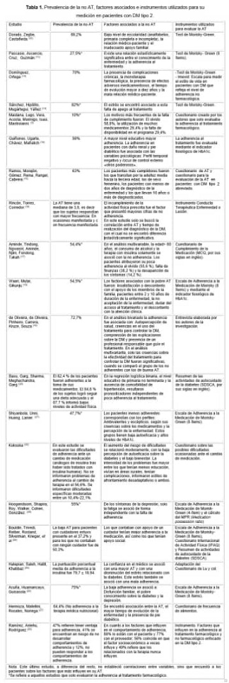 Si analizamos que el tratamiento de la DM tipo 2 exige mantener las cifras de glucemia lo más cerca posible de lo normal y evitar las complicaciones agudas y crónicas de la enfermedad, podrá verse que no basta solo con el tratamiento farmacológico, sino que deben incorporarse, además, cambios en la alimentación, la realización de ejercicios físicos, el autocuidado de los pies y el automonitoreo de las cifras de glucosa. Todos estos aspectos que forman parte de la adherencia al tratamiento son muy difíciles de incorporar a las rutinas diarias. Diversos estudios, que serán citados en la tabla 1, tuvieron como objetivo determinar la proporción de individuos de un grupo o una población de pacientes con DM tipo 2 que incumplían con el tratamiento orientado. De estas investigaciones se extrajo además los factores asociados a la no AT y los instrumentos utilizados en la evaluación de este constructo.